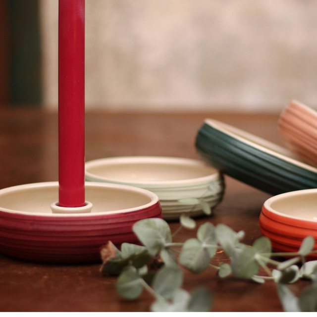 Die Kerzenschale passt sich herrlich den Jahreszeiten an. Im Sommer mit Wasser und frischen Blumen geschmückt. Im Herbst mit Fundstücken aus der Natur und zur Weihnachtszeit als schlichter Adventskranz wunderschön. Die Kerzenschalen sind in der Variante "Rille" in 6 Farben erhältlich Höhe ca 4,5cm Durchmesser ca 14cm